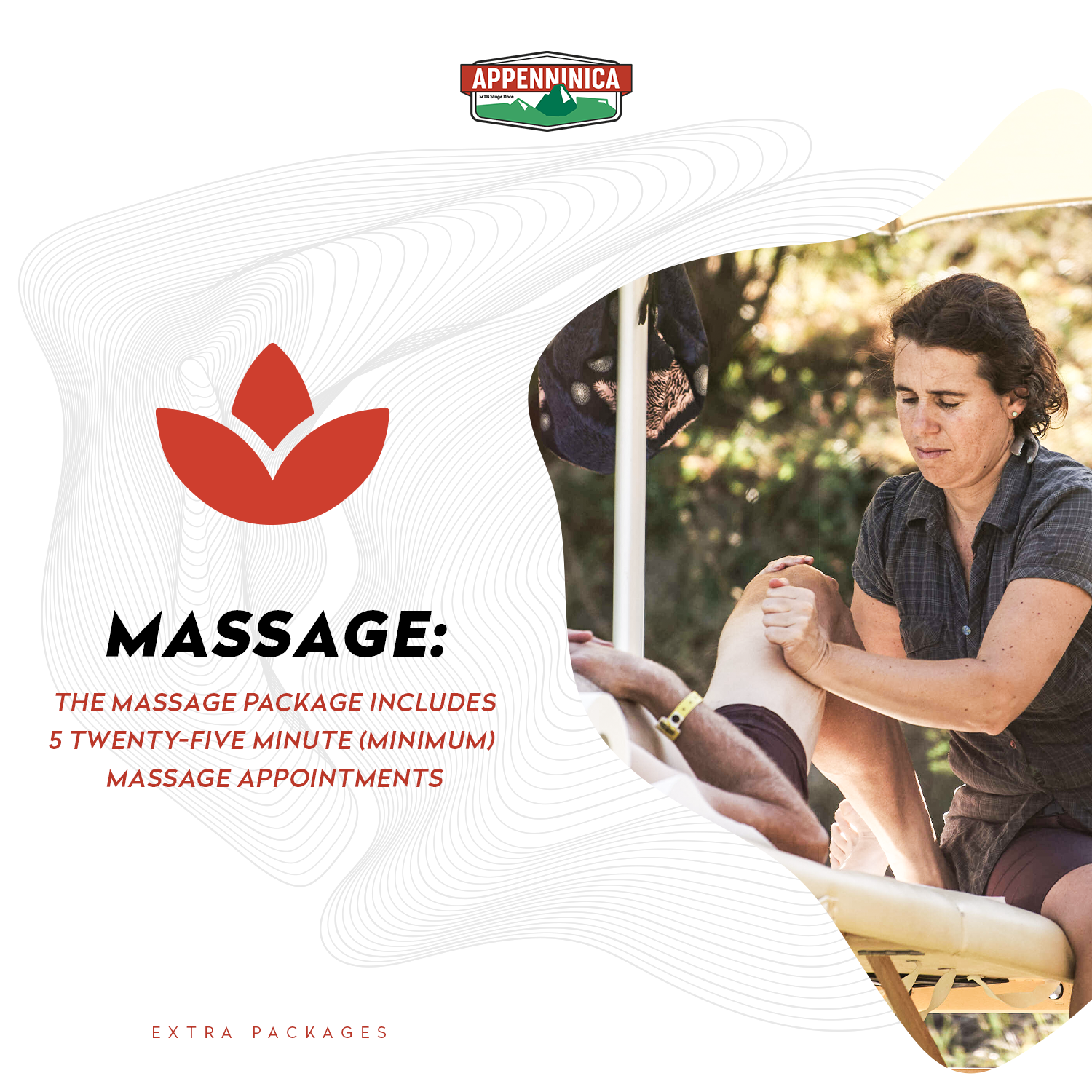 I massaggiatori saranno a disposizione nel race village Appenninica al termine delle tappe 1, 2, 3, 4, 5. Il Pacchetto Massaggi include 5 trattamenti da 25 min. (minimo) ed dovrà essere pre-acquistato.
